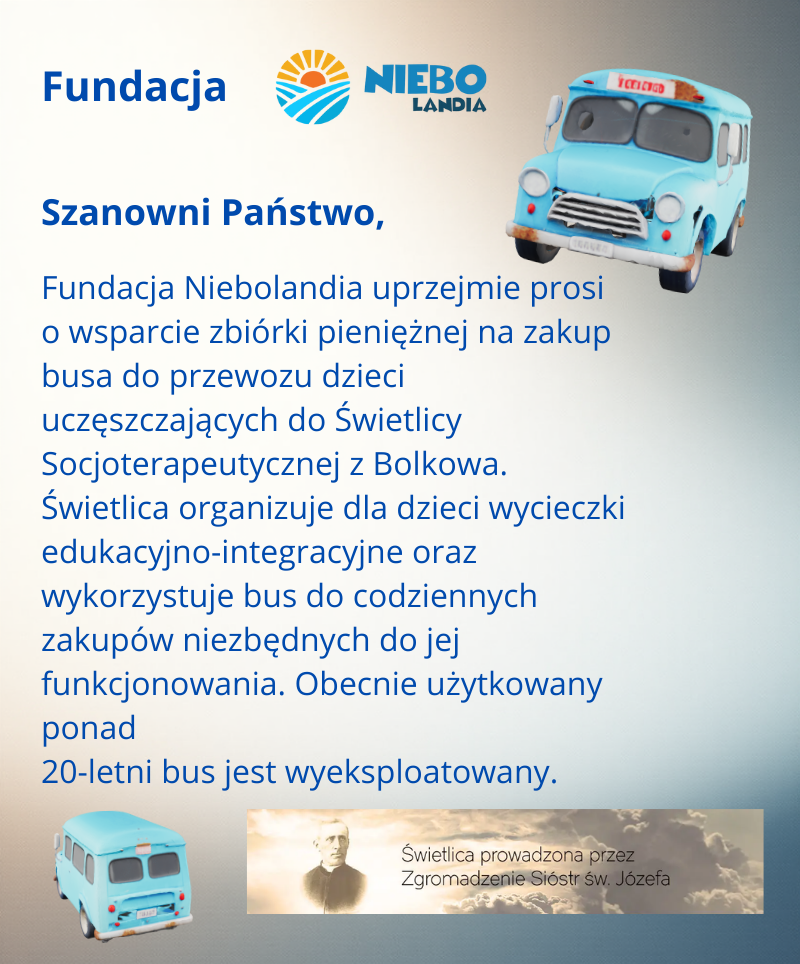 Zachęcamy Państwa do wsparcia zbiórki prowadzonej przez Fundację Niebolandia poprzez bezpośrednie wpłaty na nasze konto: